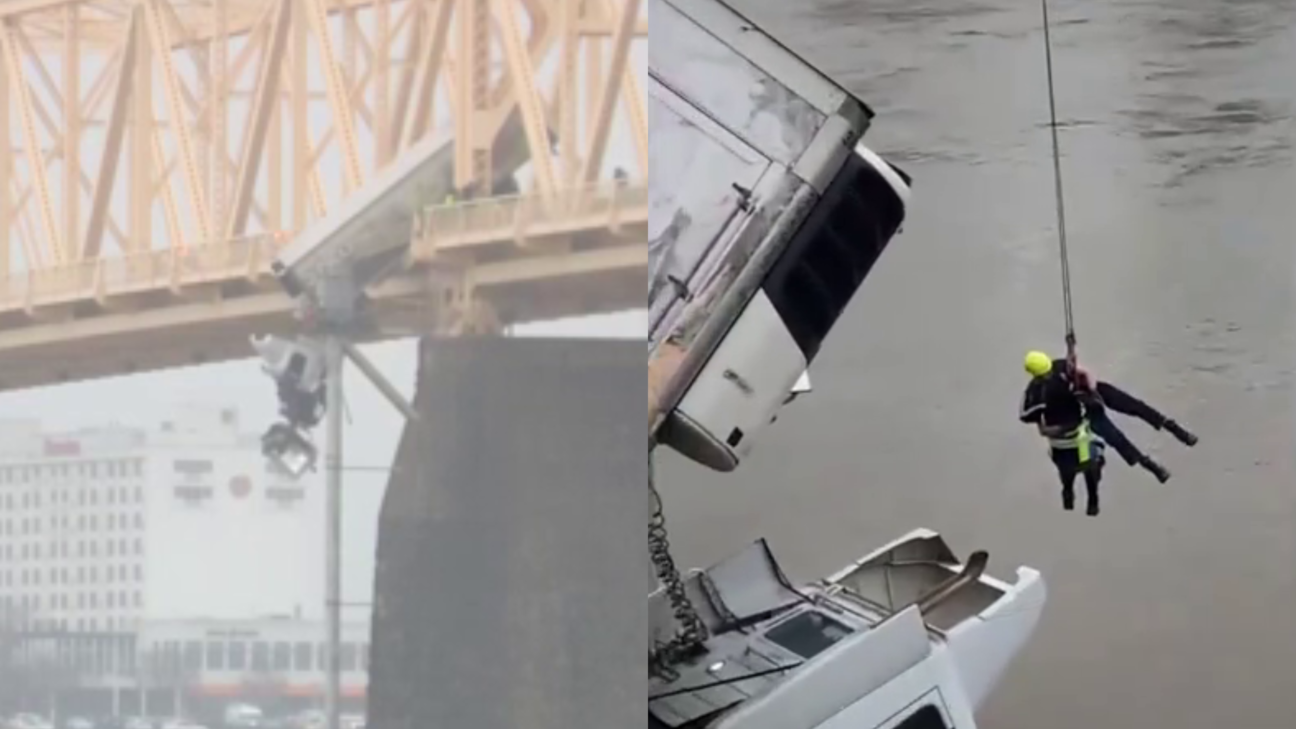 Segundo os departamentos de Bombeiros e da Polícia Metropolitana de Louisville, a motorista foi resgatada por meio de um rapel montado pelos agentes, após ficar 40 minutos presa na cabine do caminhão.