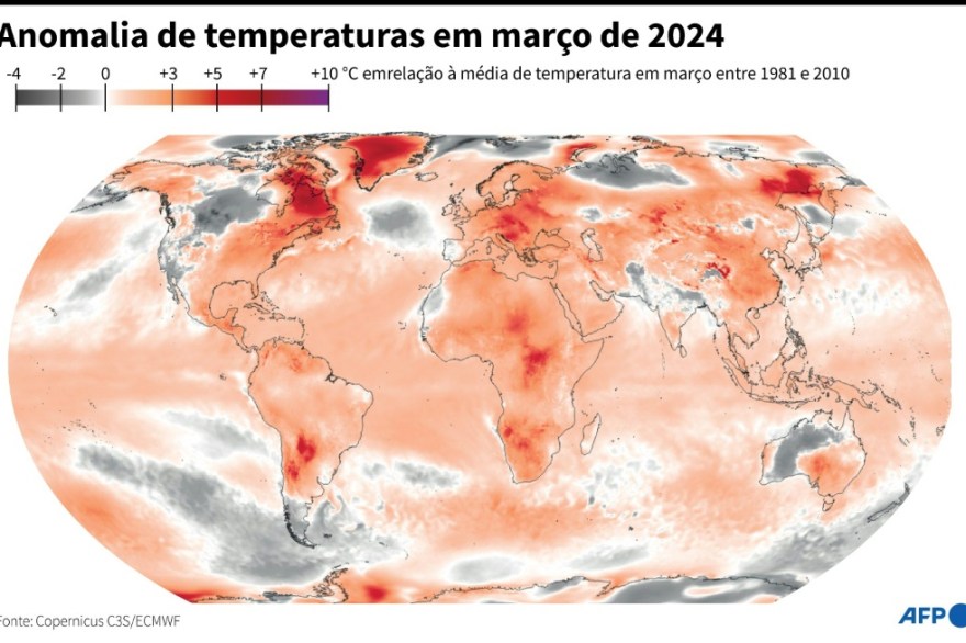O observatório europeu do clima advertiu nesta terça-feira (9) que março de 2024 foi o mais quente já registrado no mundo e o 10º mês consecutivo de recorde de calor, com temperaturas máximas que também foram registradas nos oceanos.