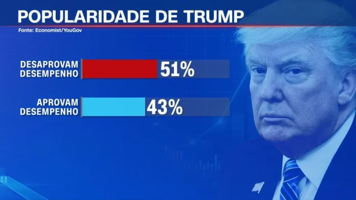 A pesquisa mostrou que a taxa de desaprovação de desempenho de Donald Trump atingiu 51%, enquanto 43% o aprovam, uma queda de cinco pontos em relação à semana anterior.