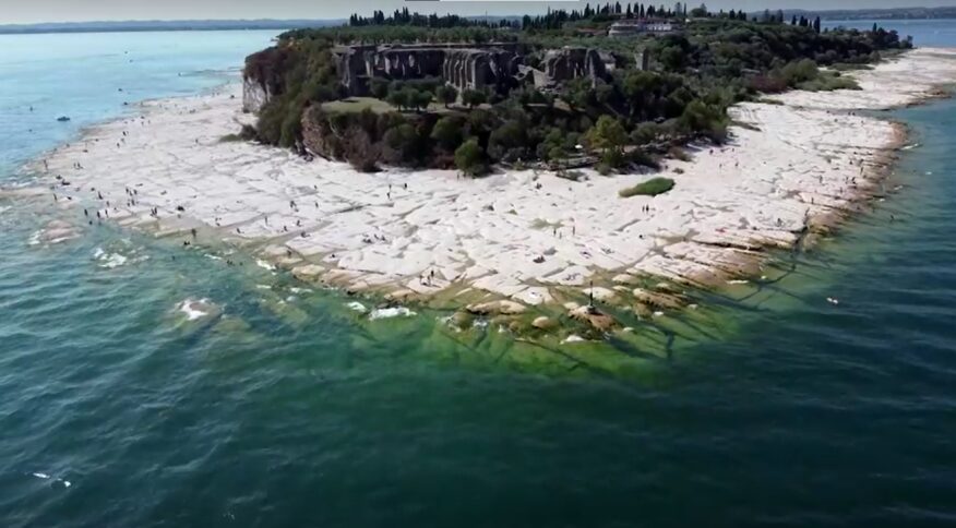 Imagens feitas por um drone nesta terça-feira (16) mostraram o fundo da costa rochosa do lago Garda surgindo em Sirmione, um resort turístico conhecido às margens do lago do norte da Itália.