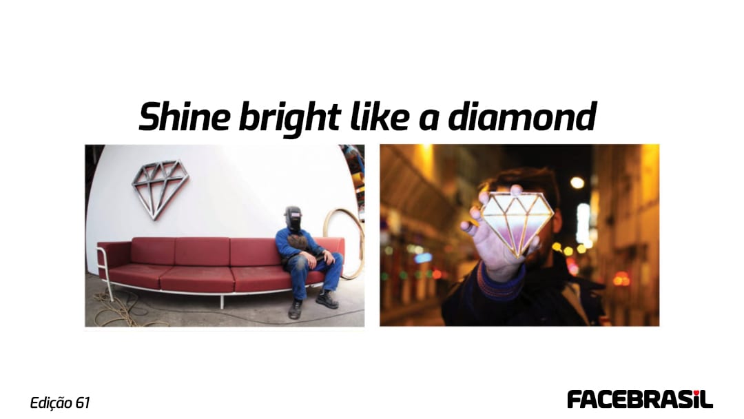 É difícil não notá-los nas ruas de grandes metrópoles como Paris, Zurique, Barcelona, Montreal e Nova York, principalmente quando sua superfície espelhada reflete a luz do sol. Com uma escada retrátil na mão e um lenço cobrindo o rosto, o artista francês Le Diamantaire espalha, desde 2011, mais de 600 “diamantes” pela cena urbana. A matéria-prima básica para compor as peças são fragmentos de vidros e espelhos que ele mesmo recolhe pelas ruas. Os diamantes são cortados à mão em vários tamanhos e pintados de diversas cores, de modo que não existam dois iguais em nenhuma esquina do mundo. Le Diamantaire trabalha com a ideia irônica do lixo transformado em símbolo de luxúria e beleza. O objetivo é dar uma segunda vida ao objeto e um presente à cidade, mas também causar inveja no transeunte, que não pode possuir o bem de que ele mesmo se desfez.